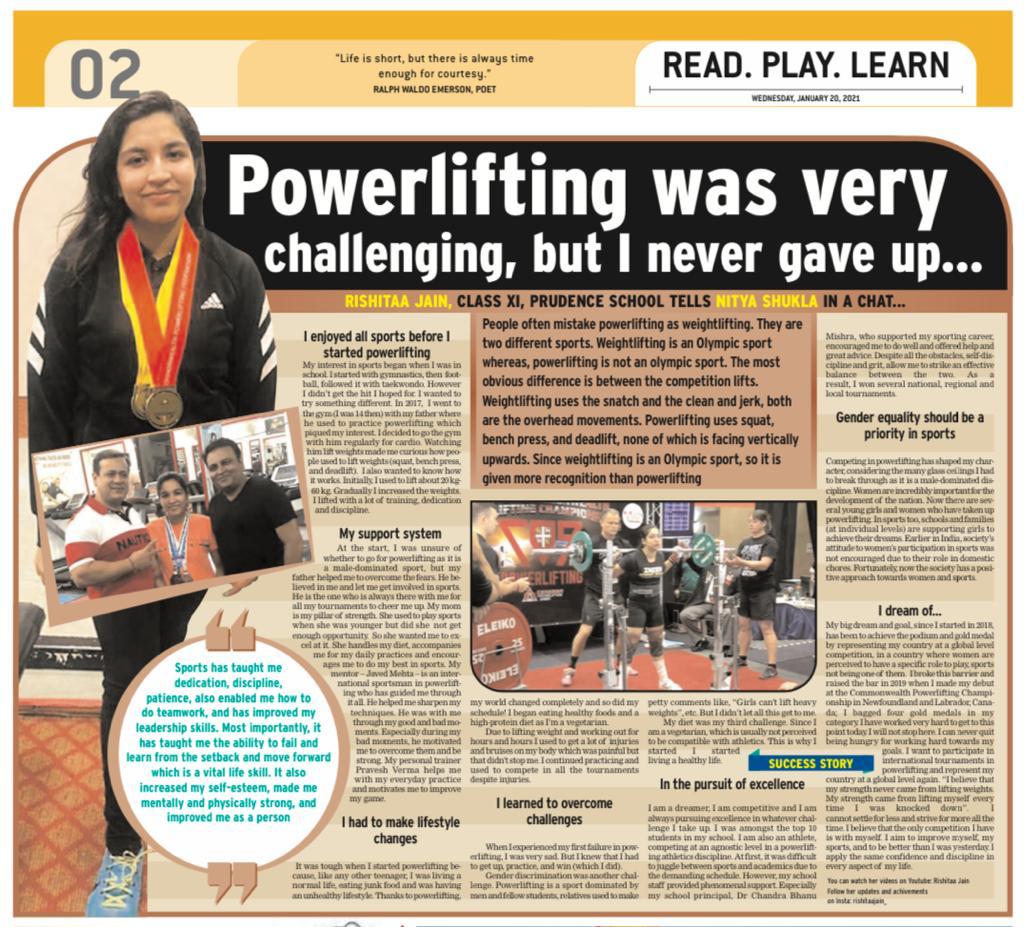 Congratulations to Rishitaa Jain of Prudence School, Ashok Vihar for winning GOLD 57KG SUB JUNIOR GIRLS Category in Delhi State Powerlifting Champions...